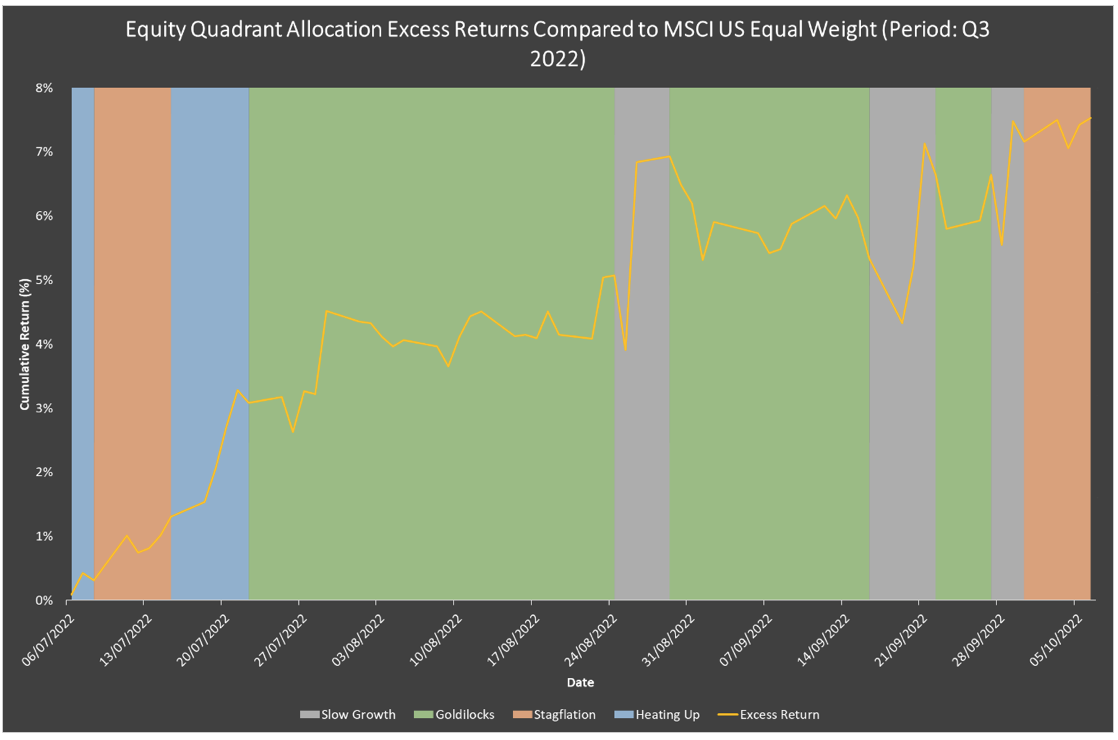 The strategy generated significant excess returns compared to the MSCI US Equal Weight Index over the last quarter. It positioned its holdings for inflationary regimes (i.e. Stagflation and Heating Up) during the early summer, before taking advantage of the temporary drop in inflationary pressure and adjusting the exposure to the Goldilocks regime. Furthermore, brief shifts to the Slow Growth regime during this period allowed the portfolio to avoid substantial losses.