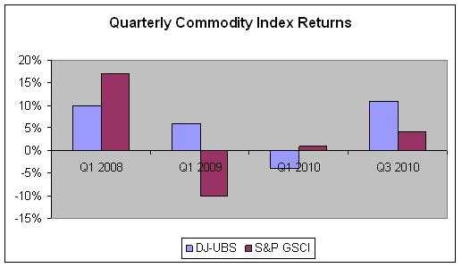 Commodity indexes did better in the third quarter than the first half of the year, as Barclays Capital analyst Kevin Norrish pointed out in a report. Overall, two key benchmarks, the S&P Goldman Sachs Commodity Index and the Dow Jones UBS index, have been less volatile in 2010 than in the previous two years, a period that included steep drawdowns during the 2008-2009 crisis and the subsequent partial recovery.
