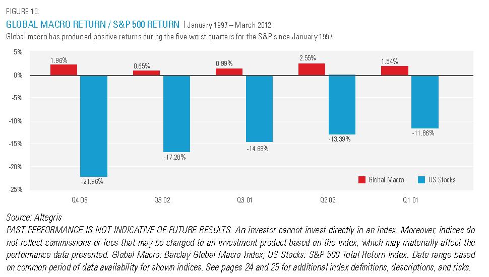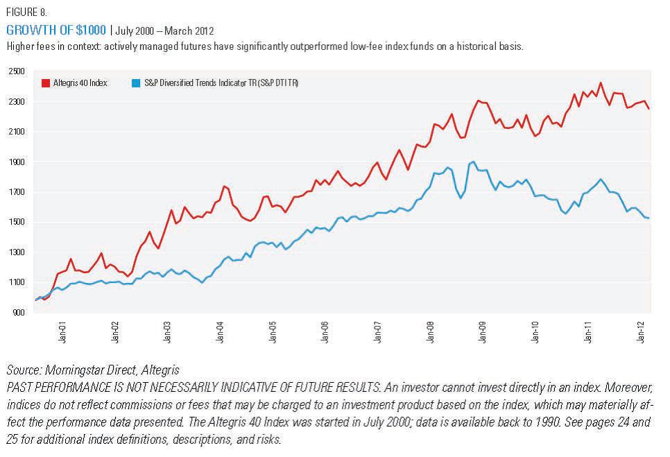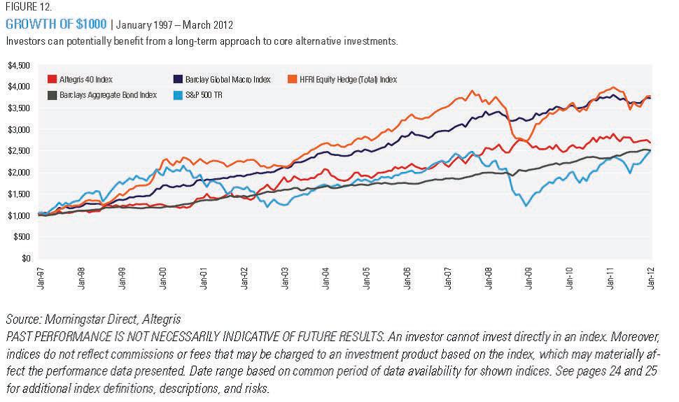 In order to facilitate these opportunities for investors, an advisor should possess the expertise in alternatives to blend top-down viewpoints with bottom-up analysis to identify the most compelling market opportunities for clients and the best-of-breed managers within each strategy. A detailed assessment and multilayered due diligence process for each manager is also essential before an investment is approved. An advisor must then be able to provide an entrée to managers who are often capacity constrained or have historically provided limited access to non-institutional investors. Once strategies are implemented within a multi-manager portfolio, the advisor should utilize advanced return analysis and risk profiles to actively manage and rebalance the portfolio. Finally, the advisor should have the resources to perform an ongoing evaluation of each manager in the portfolio-including constant investment review and risk monitoring. This blend of alternatives background, investment skills and analytical resources is rare among investment advisors, based on our experience, and is a key rationale for partnering with a firm such as Altegris. For mutual fund investors more accustomed to low-cost, index-based products, the higher fee levels often associated with exposure to liquid alternatives can be an issue. At Altegris, we believe that true talent is worth paying for-from a mutual fund investor's standpoint, potentially higher fees are appropriate in exchange for access to some of the best investment talent in the world: an elite group of managers within the alternative investment universe with a history of consistently generating strong risk-adjusted returns in both up and down markets, supported by institutional-quality infrastructure. Whether in private placement or mutual fund format, the best managers can be more expensive for investors to engage directly-if they are open to new investors at all. Regardless of the vehicle, the best managers are in a position to be able to command higher fees-if they can deliver consistently strong risk-adjusted returns, those fees represent a wise investment, in our view. Figure 8 shows the extent to which a higher-fee investment can compound assets relative to a low-fee vehicle. Within Morningstar's managed futures category, many passive strategies-which generally feature lower fees than their actively managed counterparts-track the Diversified Trends Indicator (DTI) Index, which can go both long and short depending on whether prices are above or below their seven-month moving average. In our example, we compare the compound growth of an initial $1,000 investment in the DTI with an identical allocation to the Altegris40, an asset-weighted index that comprises the 40 largest managers in the managed futures space. Managers report their returns net of both performance fees (typically around 20%) and management fees (around 2%) for inclusion in the Altegris 40 Index. As such, the substantial 73% difference in the compound of the allocation to that index vs. an investment in the DTI since July 2000 underscores the notion that higher fees can be worthwhile in the service of better returns. Certainly, passive exposures via indices, such as in exchange-traded funds (ETFs), represent a viable- and popular-option for investors seeking more liquid access to alternatives. However, Altegris believes that actively managed mutual funds have the ability to best capture the risk-return attributes of core alternative investment strategies such as long/short equity, managed futures and global macro due to their nimbleness and flexible investment opportunity sets. Preparing for the Markets' Next Phase Particularly in light of recent history, we believe that it is critical for investors in formulating their long-term plans to maintain investment flexibility and focus on strategies with the ability to perform in a variety of market conditions. At the same time, we also believe that the ability to go long and short in various asset classes is a key driver for extended investment success. While it's difficult to draw up a macroeconomic forecast for the next few years, volatility in the markets is a factor that will always exist to some extent regardless. As a result, we believe it is important for portfolios to incorporate investments that are able to not only withstand times of increased market volatility, but potentially profit from them as well-and managed futures within our alternatives core may be one such investment (See Figure 9). Managed futures have historically performed well in a wide variety of market conditions, including when expected volatility is high or simply shifting. The ability of managed futures to perform despite market volatility may, therefore, be beneficial to those seeking to counter market uncertainty. Beyond preparing for continued volatility, we believe that investors should endeavor to build a diversified portfolio and position themselves to take advantage of a range of market opportunities by allocating to a mix of so-called "convergent" and "divergent" strategies that are available in liquid structures-a topic that Altegris plans to examine in greater detail in an upcoming white paper. Convergent strategies are based on the idea that the intrinsic value of securities and asset classes can be measured using fundamental data. By analyzing this data, a convergent manager can express an opinion on whether a security is over-/undervalued, believing that the price will "converge" to its intrinsic value over time. Long/short equity is a prominent example of a convergent strategy. Divergent strategies, in contrast, aim to profit when fundamental valuations are ignored by the market. These strategies-of which managed futures is a prime example-seek to identify and exploit serial price movement (trends and momentum) that reflect changing market themes and investor sentiment. Global macro is a strategy that could fall under either category, depending on 