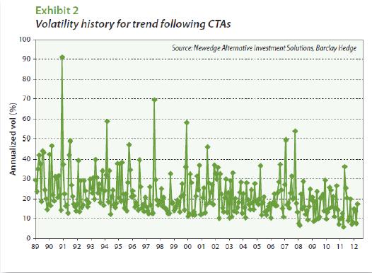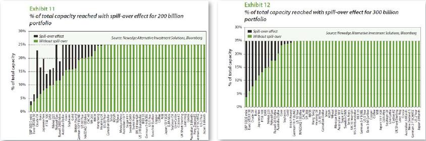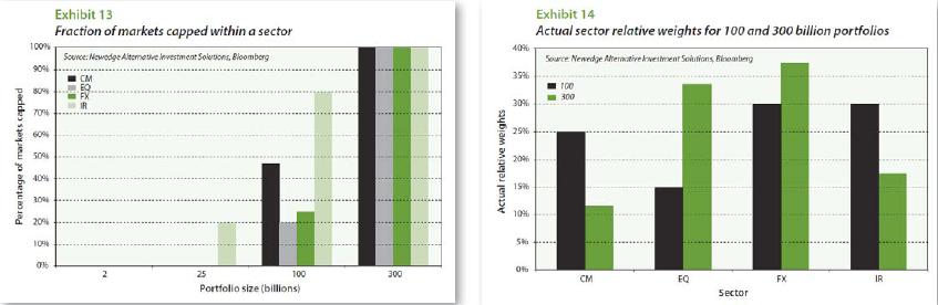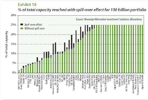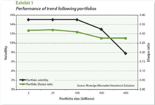 Futures markets are generally very liquid and likely would have no trouble accommodating a much larger industry's positions or the trading that would accompany changes in market direction. The single medium-term trend following manager approach For the purposes of this discussion, we will assume that the entire industry can be treated as if it were a single manager who employs a medium trend following model - in particular, the Newedge Trend Indicator model - that uses a single set of look-back parameters over a broad set of markets and that is always in the market.1 Using a slightly modified version of this model, we can calculate hypothetical position sizes for the industry at various levels of assets under management, compare them with the sizes of the various futures markets, and consider how the model's performance characteristics would decay if its position sizes are constrained by open interest in those markets. The main argument for such an approach is that the industry is dominated by trend following - much of which can be described as medium-term to long-term trend following. Trend following returns are the dominant signal in any index of CTA returns. Perhaps the single greatest strength of the Newedge Trend Indicator model - or any similar medium-term trend following model that trades a wide range of markets - is that it allows us to approximate the sizes of the positions that trend following CTAs take in various markets. Thus, even though trend followers tend to enter and exit markets at different times, at some point, most successful trend followers' positions sizes and market directions will overlap much of the time. And at these times, the approximations afforded by the Trend Indicator will allow us to glean insights into where the stress points might be. The arguments against such an approach are several.