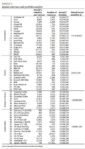 Even so, as we have been reminded many times, if one doesn't assume something, one cannot even begin to answer questions about the industry's capacity. In fact, the assumption that underpins this discussion is hardly the worst and has the redeeming virtue of allowing us to learn something useful about how the industry's growth may influence its risk-adjusted returns and return volatilities. For that matter, a simple model allows you to get some insight into a more complex problem. The Universe may not be one sun and one planet, and they may not be point masses, but this simple model can give you a great deal of insight into the more complex Universe. A broadly diversified trend following portfolio The key elements of any trend following model are the markets that it trades, the momentum rules that it employs to trade those markets, the risk that it allocates to each market, and the overall risk that the portfolio strives to achieve. For the purposes of this work, we use the same 55 markets that are used in the construction of the Newedge Trend Indicator. This is a broad and representative set of markets that cover currencies, interest rates, equities, and commodities. We also use the same momentum rule - a 20-day/120-day moving average model - that we use