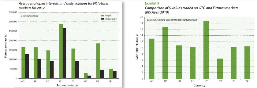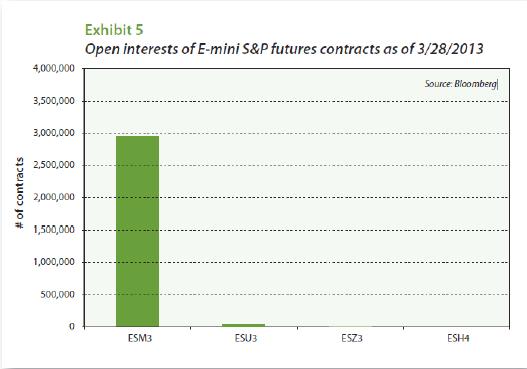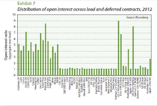 And within these sectors, we strive to allocate equal amounts of risk to each market traded within a sector. Our experience suggests that these allocations vary widely across trend following CTAs, but that the set we have chosen yield portfolio returns that are reasonably well correlated with trend followers' returns. ![]() The last piece of the puzzle is the overall risk target, for which we have chosen a 15% annualized return volatility. As shown in Exhibit 2, such a target falls roughly in the middle of the range of return volatilities that trend followers have delivered for the past decade or so. To finish the job of constructing the portfolio, we chose a notional portfolio size of $2 billion and used Before leaving this section, we should note that the position sizes shown in Exhibit 3 are the product of two kinds of volatilities. One, of course, is the portfolio's volatility target of 15%. The other, though, is the expected volatilities of the 55 markets traded. The portfolio shown here is based on 2012 market volatilities, which were relatively low when compared with many earlier years. One consequence of an increase in market volatility would be a decrease in overall position sizes to maintain a target volatility of 15%. Open interest Open interest in futures markets measures the open long (or short) positions at any given moment and represent, in a sense, the amount of risk that traders - both long and short - choose to take in the form of futures contracts. Before embarking on the work of seeing how CTA returns might be affected by a substantial increase in assets under management, we would like to touch on three matters that merit consideration. These are: (1) the fluid nature of open interest; (2) the varied distributions of open interest across contract months; and (3) the CTA industry's preference for trading currencies in the over-the-counter forward market. ![]() The fluid nature of open interest In practice, the number of open positions is fluid rather than fixed and varies over time as new positions are taken or old positions are offset and closed out. Unlike a market for equities or bonds, where the total amount of risk that must be taken is determined by the value of equities or bonds outstanding, the amount of risk taken in futures markets - as measured by open interest - is a matter of choice. And any given trade can produce either an increase, decrease, or no change in open interest. For example, if someone who is already long futures buys futures from someone who is already short futures, open interest will increase. If someone who is already long futures sells to someone who is already short futures, open interest will decrease. And if someone who is already long futures sells to someone who is also already long futures, the result will be no change in open interest.2 To illustrate this point, we have provided open interest histories for four commodities in Exhibit 4 - one for crude oil, one for British pounds, one for the S&P500, and one for 10-year treasuries. All four have been normalized so that open interest in 1995 is indexed at 1.0. Notice first that open interest in all four markets has grown substantially over the period shown, although the path taken by 10-year treasury futures has been radically different from the other three. With the exception of the equity futures contract, open interest today is substantially larger than it was ten years ago. It is a bit odd that open interest in equity futures has fallen over the past five years, but as we will find, equity futures markets will prove to be the least constraining in this exercise. The distribution of open interest across contract months In government bond, equity index, and currency futures, nearly 100 percent of the open interest will be either in the “lead” contract (i.e., the contract that is about to expire) or in the “first deferred” contract (i.e., that contract that is about to become the lead contract). An example of what the distribution of open interest in e-mini S&P500 futures looked like on March 28, 2013, is provided in Exhibit 5. This pattern will hold until market participants want to shift their risk taking to the next most active contract month. In the case of equity index and currency futures, this shift typically takes place in the week before the lead contract expires. In government bond and note futures, the shift depends on the market. In the case of U.S. Treasury futures, the shift takes place during a few days toward the end of the month before the lead contract expires - chiefly because most futures participants want to avoidany possibility of taking delivery of actual bonds. In the European and Asian markets, where delivery rules are different, the shift tends to take place closer to the lead contract's scheduled expiration. ![]() ![]() ![]() Commodity futures, on the other hand, make much fuller use of deferred contracts. Exhibit 6 provides an example of the distribution of open interest in crude oil futures across contract months. As you can see, there are ample open positions in many of the deferred contracts. A summary of these patterns is provided in Exhibit 7, which shows the ratio of total open interest to lead contract open interest for the 55 markets traded by the Newedge Trend Indicator. In the work that follows, we use each market's total open interest. Foreign currency markets Perhaps the only market in which transaction economics favor over-the-counter trading over futures trading is the currency market. For this reason, the greater part of currency trading done by CTAs is done in the forward market. This raises a practical problem for us because there is no analog for open interest in the over-the counter market. At least no analog for which there is a useable measure. ![]() To deal with this, rather than trading the currency market as a boundless source of trading positions, we applied the following logic. First, we can compare open interest and trad