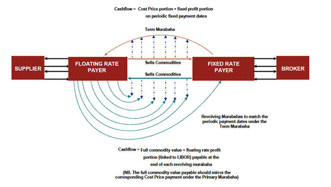 Source: Allen & Overy For the floating leg, we are allowed Murabahas with markups linked to LIBOR. We can enter into consecutive Murabahas on a rolling basis, with Wa'd to enter into Murabaha at the market price + market determined LIBOR to make for rolling Murabahas. For the exotic leg, some scholars would allow the linkage of the Profit Rate of the Murabaha to be almost anything so long as it is determined as of the time of entering into the Murabaha. So range accruals (i.e., the profit rate is LIBOR + X accruing times the number of days LIBOR is in between LowerBound and UpperBound) and almost any exotic payoff can be used as a markup so long as it is set at the time the Murabaha is entered into.