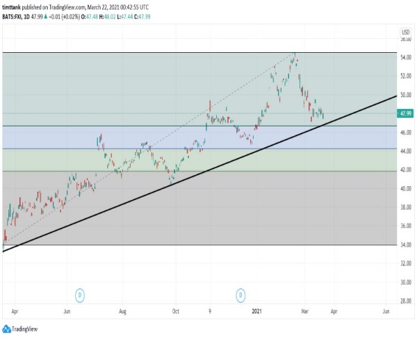 Buy dips in FXI to $46.67 with stops on a close below $46 and with an upside target for taking profits at $55. If stopped out, try the longs again at $44.50 with stops below $44.