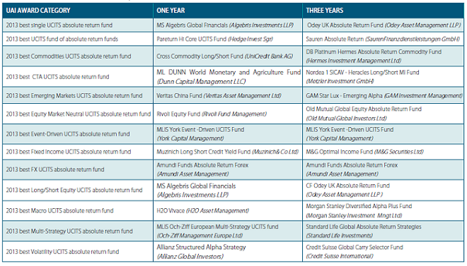 "I would like to congratulate all the winners of the 2013 UAI Awards. These distinctions reward not only the best performing funds over the last 12-month period but also the ones that succeed over the longer term which is really what investors are looking for. Since their launch the UAI Awards have become one of the most significant - and more importantly truly independent - distinctions in the UCITS absolute return funds industry."