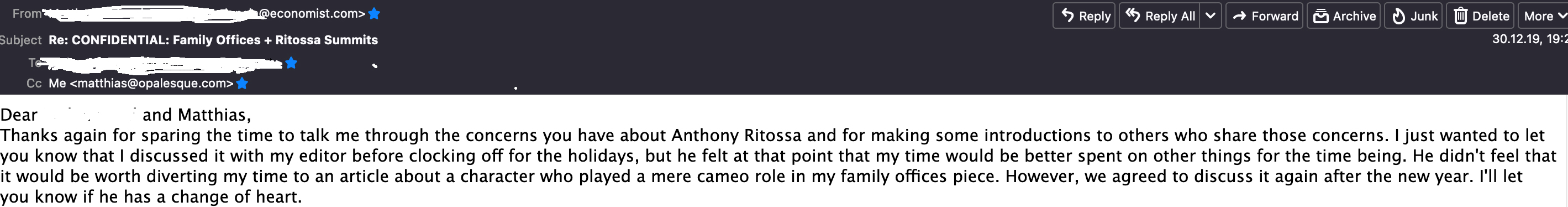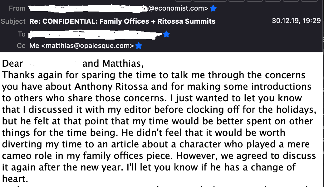 Following my 2018 article, one call stood out, it was from one of Ritossa's previous sponsors who was UPSET how venerable ECONOMIST highlighted Ritossa's conferences, about which he had first hand experience of being a fraud: https://www.economist.com/briefing/2018/12/15/ family-offices-become-financial-titans