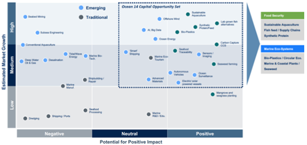 Matthias Knab: And how are you expressing or implementing the impact measurement in your investment processes? Max Gottschalk: We have set up separate investment and impact due diligence processes. Our impact process runs in parallel to the investment process and the impact committee has veto rights on any investments we do. Unless the impact committee feels that the investment has impact merit and meet our impact KPIs, the committee has the right to stop the investment committee making an investment into a company irrespective of the quality of the transaction. We are setting impact objectives and KPIs that each investment must meet in order to be eligible. The impact team will be responsible for defining those KPIs and then also making sure that they are comfortable that the company can meet them. They will then also be working with the companies in measuring, auditing and reporting the impact. Matthias Knab: Can you also give us some examples of companies and opportunities that you see in the maritime space that excite you? Max Gottschalk: Let’s start by looking at the ocean or the blue economy which is a fairly large economy in itself. It is a three trillion dollars a year economy. It feeds about one-third of the planet, so 3 billion people rely off the ocean for protein daily. Oceans are not only a very important food source of protein for humans but it also employs more than 200 million people. There is a tremendously buzzing economic activity that goes around the oceans and with about 16-17 underlying industries very diverse, spanning from transport, tourism, renewable power, mining, fishing and so forth. We are focusing on those sectors that are both fast growing but also have a positive impact. A number of industries, like deep sea mining, can offer high growth but clearly is bad for the environment, so we will avoid such areas. We are using the sustainable development goals (SDG) set by the United Nations – SDG 14 is “Life under Water” – hence our name Ocean 14 Capital. We have broken down SDG 14 into two areas. First, food security, like sustainable fishing where we will focus around the aquaculture and the fishing industry which today is a $250 billion market and growing at about 7% per annum. Half of the fish we eat today is produced by aquaculture and aquafarming, and that industry is growing around 10% per annum for the next foreseeable future. Most of the growth and demand will be met by aquaculture and so that sector offers some interesting opportunities and even some disruption opportunities through technology that are interesting. We also research new technologies and practices in the fishing industry which is a field we are excited about. There is also the sub-sector of fish food we are also looking at very closely. We see an opportunity in insect protein as a fish food ingredient, this is also a high growth business as demand for insect protein far outstrips supply. It is estimated the supply won’t be able to meet the demand for at least the next five years. It’s a high margin business, so typically around 80+% growth profit with a 30% EBITDA margin. Secondly, we will look for Marine Ecosystem investment opportunities and the large CO2 sequestration possibilities. The ocean is at the heart of the solution for climate change and there are plenty of ways in which the ocean can capture the carbon that we are emitting each year. Currently, 25% of the carbon that’s emitted is captured by the ocean each year. For example, seaweed plantations will benefit from increased investments because of their ability to capture a lot more carbon and more rapidly than trees, while also providing a source of food. That alone is an area that offers strong investment opportunities.