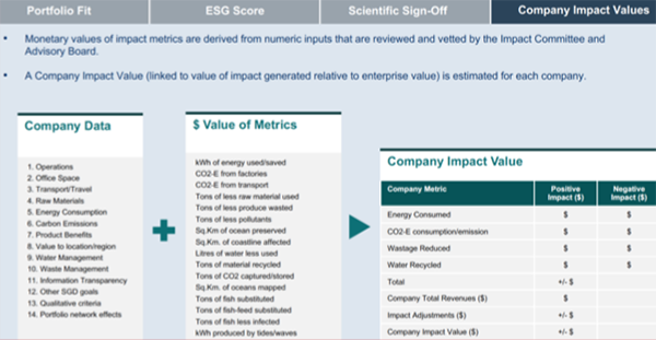 This Ocean 14 Capital team is then supported by 12 people and the entire institutional infrastructure of Vedra Partners. Through connection to Blue Marine Foundation, we have put together a Board of Advisors to help us source and validate investments and create value for our investment portfolio. It’s quite a large and influential body, so as of today we have 25 advisors signed up with a contractual agreement to Ocean 14 Capital where they provide us consultancy service, finding deals and then also introduce us to investors that want to actively engage with the fund. These advisors are some of the world’s best scientists from marine science, marine biology, we have experts on aquaculture, on coral reef management, on biodiversity, so we have probably put together one of the most comprehensive Board of Advisors in the world to help us source deals and making sure that our investments are good investments and help us create value. We have been very careful in crafting this Board and provided our advisors with a carry in the fund, so they are totally aligned with the success of the organization and in providing us with value. Apart from these relationships with scientists, we have also connections with governments, other businesspeople and teams from the impact sphere – people who have been instrumental in the last 5-10 years developing impact measurement tools and impact reporting methodologies. For Ocean 14, impact must be at the heart of what we do. While we are an investment company and need to deliver strong performance to attract capital and so are driven by financial return, we have an equal focus on achieving a positive, measurable impact that we can then report back to investors. The way we do this and provide transparency for investors is by breaking down the return of an investment in two components. One is the financial return that will give investors a Net Asset Value at the end of the investment and giving them an internal rate of return. But then with our impact team, we are also looking at measuring impact by providing a dollar value to the impact. The aim here is to provide a direct relationship between financial investment and impact return in dollar terms, giving investors a Net Impact Value (NIV) and impact internal rate of return together with impact value and impact ratios. So what we are looking to do is providing a simple and transparent methodology so that investors at the end of each year nominally have a return on their investments together with the impact return that’s measured, audited and reported back to them. We decided from the start to have a very solid approach towards impact investment measurements. That is important because as investors are going to require the transparency as to the impact of each investment. They want to know the impact of their investment in order to report it back to their respective stakeholders. We are working with auditors and impact experts to develop and introduce a methodology to do that and plan to publish a white paper on impact measurement or impact management tool paper sometime in Q1 or Q2 this year. We are quite excited about this part of our work. We think of impact measurement as a really important step one has to take, and we are committed to lead the way in developing such tools.