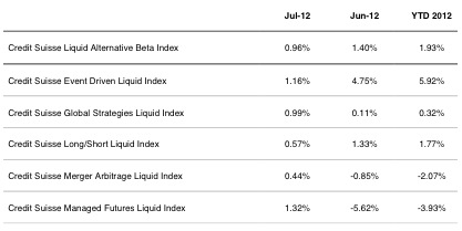 Opalesque Industry Update: The Credit Suisse LAB Index was up 0.96% in July according to Dr. Jordan Drachman, Head of Research for Alternative Beta Strategies at Credit Suisse. Dr. Drachman noted, “The Credit Suisse Liquid Alternative Beta Index (“CSLAB”), which aims to reflect the performance of the overall hedge fund industry, finished up 0.96% in July. The Managed Futures strategy was the most significant contributor to performance, finishing up 1.32% for the month. The Event Driven strategy was the second-highest contributor to performance, finishing up 1.16% for the month, and bringing performance to 5.92% year-to-date.” Performance for the LAB indices is shown below. Research, performance, descriptions, statistics and downloadable index performance history can be found online at www.credit-suisse.com/LAB or on Bloomberg.