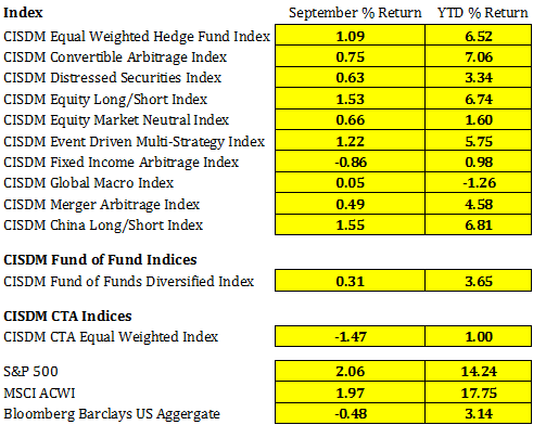 CISDM Equal Weighted Hedge Fund Index up 1.09% for September