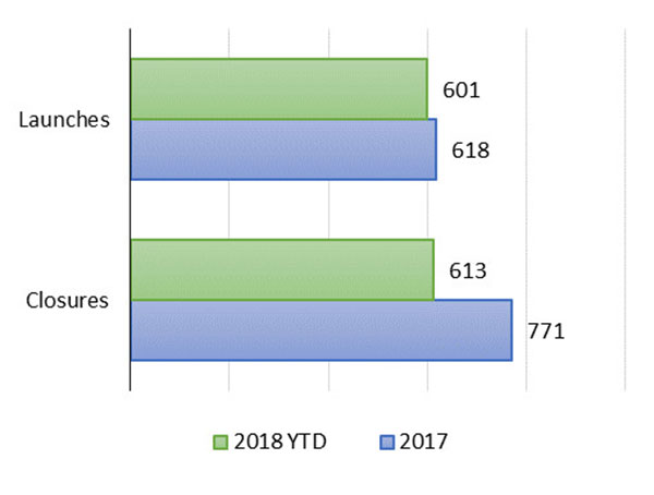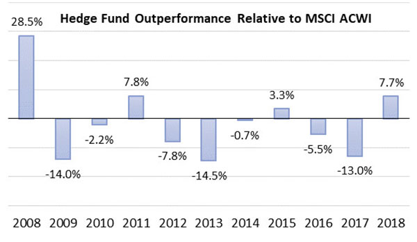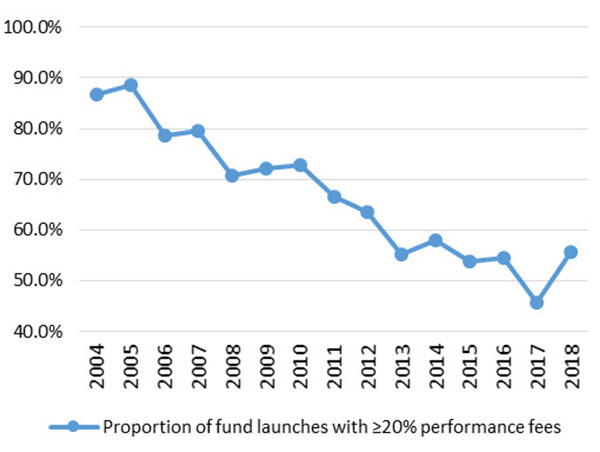 Opalesque Industry Update - The Mizuho-Eurekahedge Index (USD), an asset-weighted index representing the global hedge fund industry performance was down 0.39% in December, bringing its year-to-date loss to 4.09% amidst the global equity market sell-off. Despite ending the year in the red, hedge fund managers recorded their best outperformance over the global equity markets since 2011, as they returned 7.70% more than the MSCI ACWI IMI (USD) throughout 2018. The MSCI ACWI Investable Market Index (IMI) captures large, mid and small cap representation across 23 developed markets and 24 emerging markets countries. With 8,725 constituents, the index covers approximately 99% of the global equity investment opportunity set. It was down 9.6% in 2018. Historically, the Mizuho-Eurekahedge Index (USD) has outperformed underlying equity markets during periods of market distress, such as the years 2008 and 2011, during which the index outperformed global equity markets by 28.52% and 7.80% respectively. Launches and closures A total of 601 fund launches and 613 liquidations were recorded in 2018, marking a third consecutive year in which fund closure activities outpace launches. Among these newly launched funds, 55.7% charged no less than 20% performance fees, compared to 45.8% back in 2017. However, both figures are still significantly lower than what was observed prior to the financial crisis, during which an overwhelming majority of hedge funds charged 20% performance fees or higher.