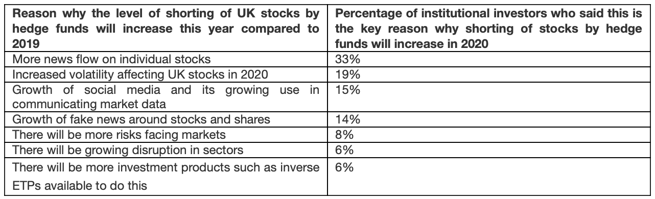 Opalesque Industry Update - New research from ETF provider GraniteShares reveals 81% of institutional investors expect the use of leveraged investment strategies to increase over the next five years. Similarly, 58% predict the level of shorting of UK stocks by hedge funds to become more prevalent this year when compared to 2019 - with one in four (25%) anticipating a dramatic rise. Only 12% expect the level of shorting of UK stocks by hedge funds to fall. This comes at a time when 71% of institutional investors interviewed by GraniteShares expect to increase their exposure to UK stocks, with the main reason given for being that they expect 2020 to be a good year for the economy. In November last year, GraniteShares launched a range of short and leveraged single stock daily Exchange Traded Products (ETPs) on the London Stock Exchange, enabling for the first-time sophisticated investors to take positions on both rising and falling share prices. In addition to this, they can also be used to hedge individual stock exposures, including those in index or fund holdings. By providing transparent access through an ETP, GraniteShares is removing the barriers that sophisticated investors face if they want to use leverage. Reason why level of shorting of stocks will increase in 2020 When asked what they think is the main reason why hedge funds will short UK stocks more this year, 33% of institutional investors interviewed said it was because there is increased news flow on individual stocks and markets in general, followed by 19% who said it's because there will be more volatility in UK stocks this year. However, 15.4% said the main reason was the growth of social media and the growing use of this to communicate market data. Some 13.5% said the main reason is the growth of 'fake' news around stocks and markets. Some 6% said it will be because there are more investment products and vehicles such as inverse ETPs available to do this.