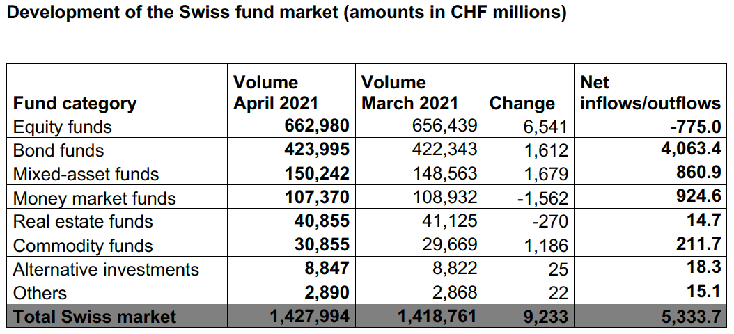 0.6%. Net inflows totaled CHF 5.3 billion. The volume of assets entrusted by investors in Switzerland to the fund industry came to CHF 1,427,994 million in April 2021 (March 2021: CHF 1,418,761 million). "The positive trend continued on most financial markets in April, although many showed a slightly slower pace than in March. With the exception of the SMI, which was just inside negative territory, the leading stock markets all posted further gains. Net inflows were recorded once again during the month, with bond funds attracting the most new money," said Adrian Schatzmann, CEO of the Asset Management Association Switzerland. By way of comparison, the figures for selected indexes in April 2021 were as follows (March 2021 in brackets): Dow Jones 2.71% (6.62%), S&P 500 5.24% (4.24%), EURO STOXX 50 1.42% (7.78%), SMI -0.23% (4.99%), SBI -0.16% (0.49%), and Bloomberg Barclays US Aggregate Bond Index 0.79% (-1.25%). The CHF gained 0.78% against the EUR and 3.25% against the USD. Net inflows in April 2021 totaled CHF 5.3 billion. Bond funds were clearly out in front with CHF 4.1 billion, while only one fund category - equity funds - suffered outflows, and these were modest at CHF 0.8 billion. There were no changes in the ranking of the most popular asset classes: equity funds 46.43%, bond funds 29.69%, mixed-asset funds 10.52%, and money market funds 7.52%.