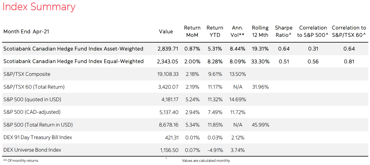 Opalesque Industry Update - The Scotiabank Canadian Hedge Fund Index ended April 2021, up 0.87% MOM on an