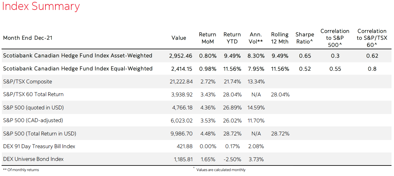 Opalesque Industry Update - The Scotiabank Canadian Hedge Fund Index ended the month up 0.80% MOM on an asset-weighted basis and up 0.98% MOM on an equal-weighted basis. The comparable benchmark indices were both up for the month with the S&P TSX 60 Total Return Index and S&P 500 Total Return Index posting increases of 3.43% and 4.48% respectively.