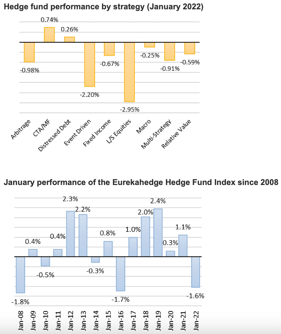 Opalesque Industry Update - Hedge fund managers ended the month of January down 1.55% on an equal-weighted basis, and down 1.10% on an asset-weighted basis, according to Eurekahedge data from With Intelligence. Global equity markets tanked after market risk sentiment was dampened due to geopolitical concerns over the Russia-Ukraine crisis and the increasingly hawkish policy stance of the Federal Reserve to quell rising inflation, negatively impacting the performance of hedge funds. Nevertheless, global hedge funds outperformed the MSCI ACWI by 3.69% in January 2022, marking the first time hedge funds have beaten the index since 2018. Returns were mostly negative across geographic mandates in January, with Latin American hedge funds the only exception with a return of 1.90% while Asian hedge funds trailed behind their regional peers with a return of -3.11%. Across strategies, CTA/Managed futures hedge funds outperformed their strategic peers with a return of 0.74% in January while long/short equities hedge funds were the worst performer with a return of -2.95%.