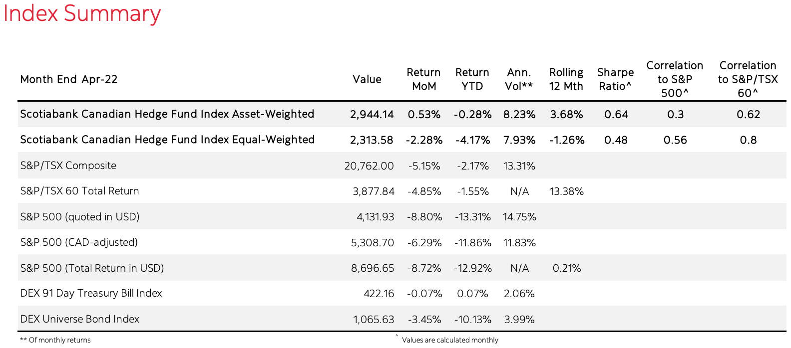 Scotiabank Canadian Hedge Fund Index ends April +0.53% on asset-weighted basis, -2.28% on equal-weighted basis