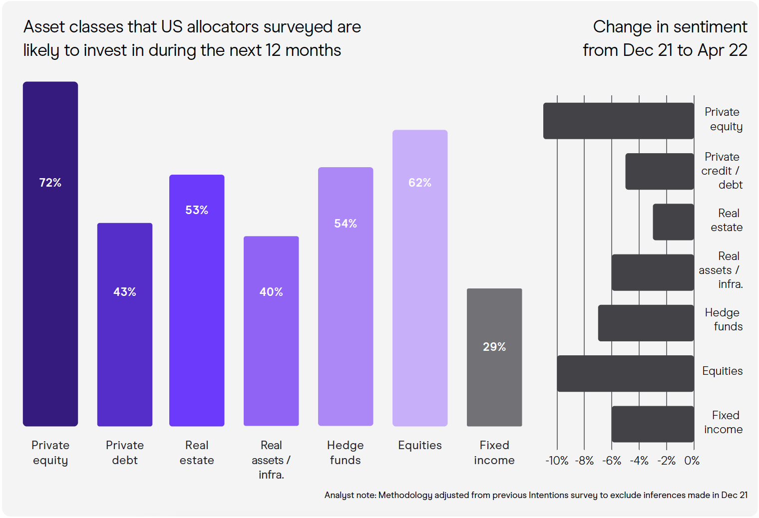 Opalesque Industry Update - With Intelligence's investor intentions data from April 2022 identified private equity (72%) and hedge funds (54%) as the alternative asset classes most likely to see inflows from US investors in the coming months. And, as in our December 2021 survey, With Intelligence's Investor Intentions update suggests that investors believe that private equity and hedge funds have delivered strong performances during the recent upheaval and offer timely benefits in terms of risk management and niche opportunities. There is little doubt that US allocators have had their heads turned by private markets in recent years. A host of institutions and private wealth investors have been recalibrating their alternatives portfolios to larger allocations in private markets and our survey of 434 investors comprising 68 family offices, 242 foundation/endowments, 36 corporate pensions, and 88 public pensions demonstrates this trend. Hedge funds ended 2021 by posting a 10.2% gain and their first net inflow in more than five years of $25bn. But, more than that, the change of sentiment from December 2021 to April 2022 is striking and all asset classes saw a drop in likelihood to invest, with the biggest in private equity and equities - down 10% and more - and the smallest decline in real estate at 3%. Among investors, foundations/endowments are most enthused (76%) about private equity due to its capacity for disruptive, high-return impact as well as its record in seeking technological solutions to social issues like climate transition. Key highlights from the report: - 72% of US institutional investors are likely to invest in private equity over the next year; with 54% are likely to invest in hedge funds. - 75% and 57% of family offices are likely to invest in private equity and hedge funds respectively over the next 12 months but are now least likely to invest in real estate due to concerns about the strong headwinds in the asset class. - Consistency of team members was cited as one of the leading priorities for investors in manager selection by 69% of those surveyed. Other priorities include GPs having "skin in the game" (67%) and the quality of risk management protocols (52%). - Corporate pensions lean towards real estate with 67% of respondents intending to invest over the next 12 months. - US investors investing in hedge funds consider the US (68%) and Europe (52%) the preferred regions for investment.d net outflows respectively.