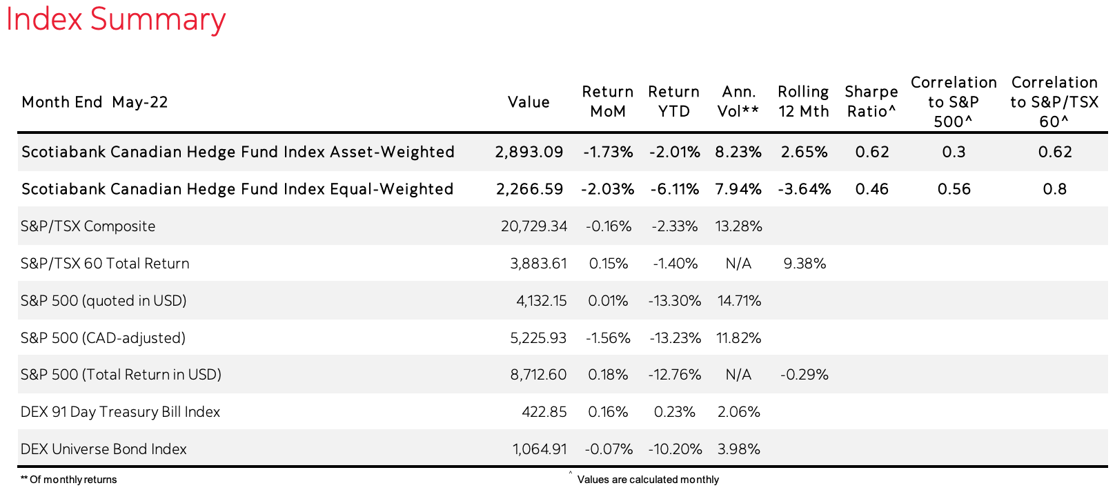 Scotiabank Canadian Hedge Fund Index ends May -1.73% on asset-weighted basis, -2% YTD