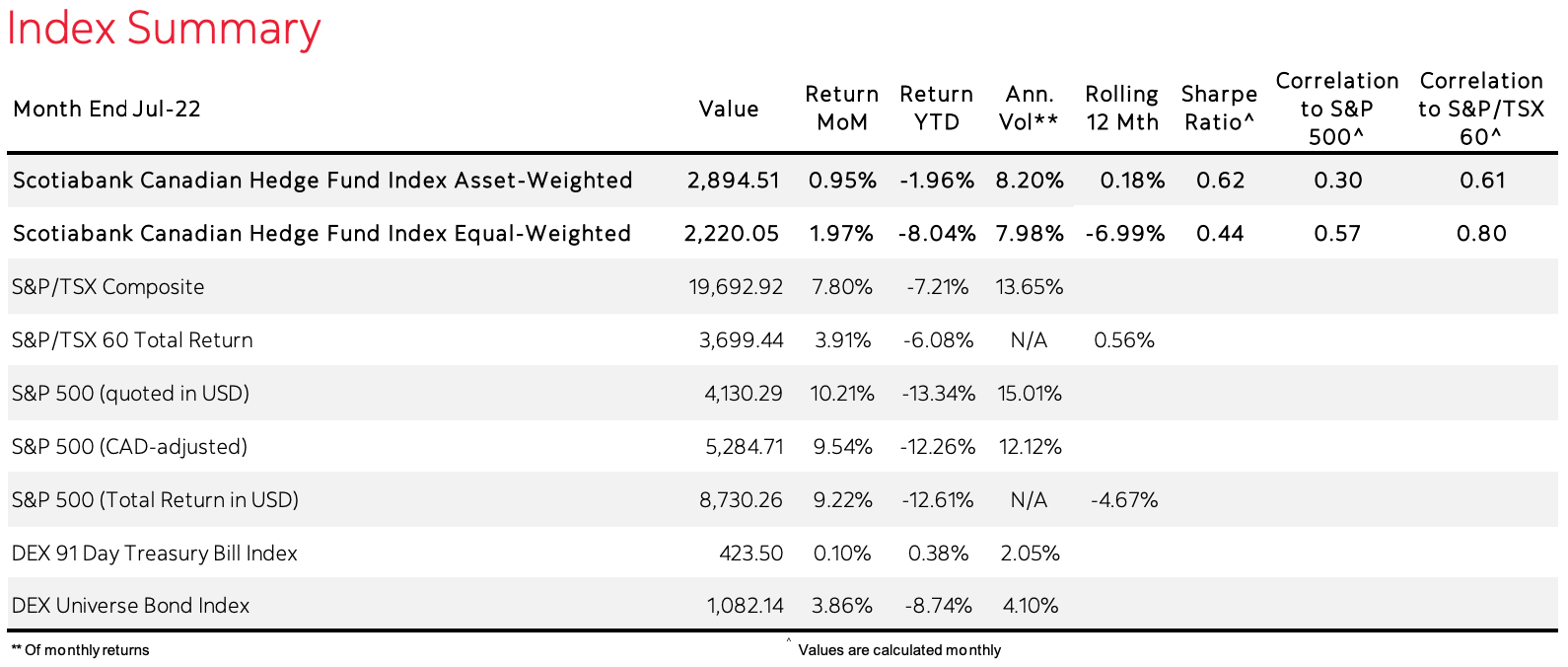 Opalesque Industry Update - The Scotiabank Canadian Hedge Fund Index ended July 2022 up 0.95% MOM on an asset-weighted basis and up 1.97% MOM on an equal-weighted basis. The comparable benchmark indices were both up for the month, with the S&P TSX 60 Total Return Index and S&P 500 Total Return Index posting increases of 3.91% and 9.22% respectively.