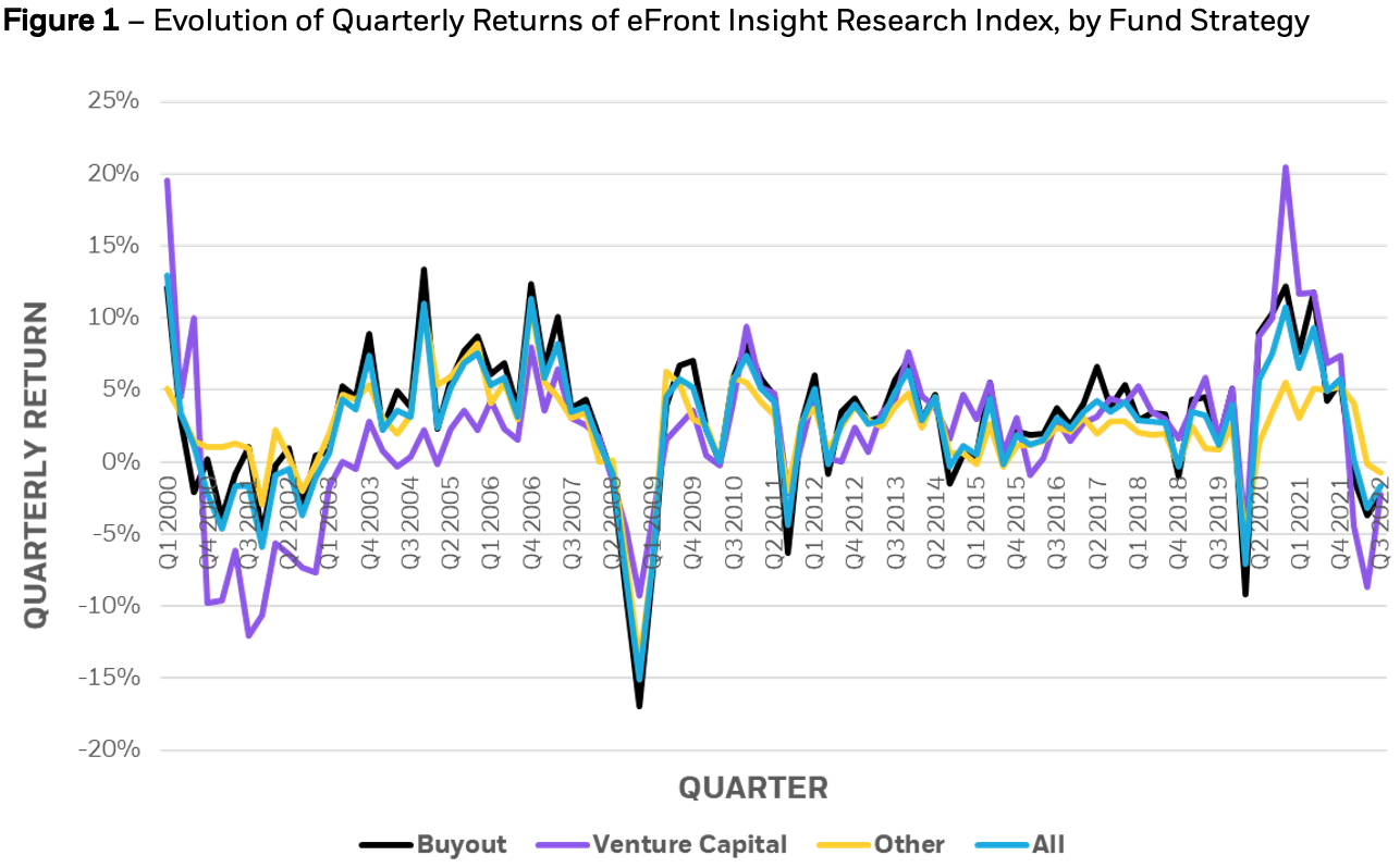 Opalesque Industry Update - eFront, the leading financial software and solutions provider dedicated to private markets, and a part of BlackRock, has released its latest eFront Insight Quarterly Performance Benchmark report, covering the period to the end of Q3 2022. The report shows that in the first three quarters of 2022, returns for private markets dropped to below zero for the first time since the outbreak of the Covid-19 pandemic in Q1 2020. In Q3, global buyout funds fell by -2.4%, following losses of -1.2% and -3.7% in the first and second quarters respectively. Global venture capital investments lost -2.3% of their value, following even larger drops of -4.4% in Q1 and -8.6% in Q2 (Figure 1).