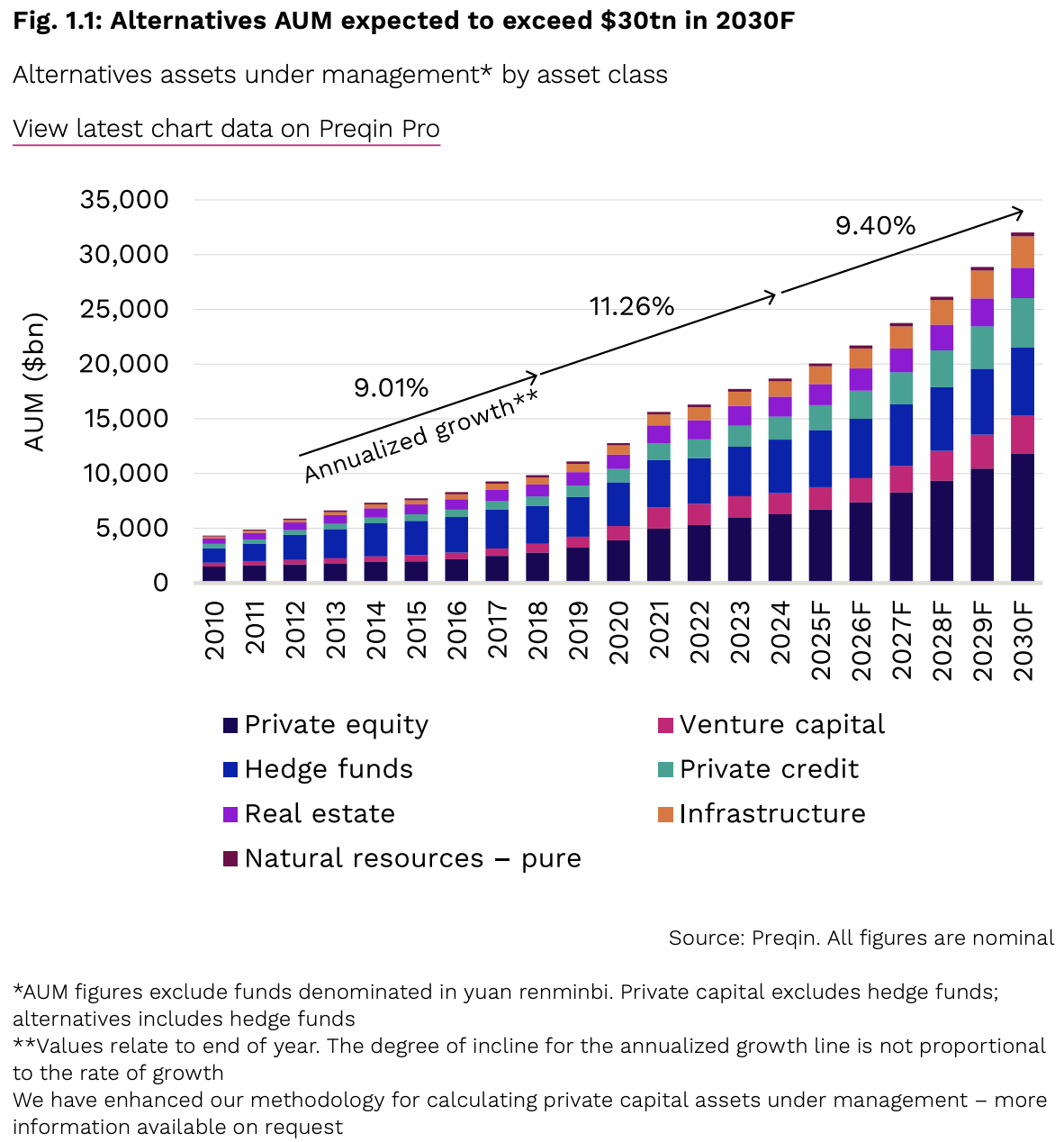Opalesque Industry Update - Preqin, a part of BlackRock, has released its flagship annual private markets publication, this year titled the Preqin Private Markets in 2030 Report. As the definitive resource for institutional investors, fund managers, and industry stakeholders, this report offers one of the most thorough analyses of the trends shaping private markets through the end of the decade. This year's report zeroes in on a key milestone: The global alternatives market AUM is expected to reach $32 trillion by 2030. This figure includes private equity, private credit, infrastructure, real estate, hedge funds, and natural resources. This is Preqin's most anticipated report of the year, setting the benchmark for data-driven analysis and forward-looking perspectives on private capital, covering forecasts for fundraising, performance, and assets under management (AUM) growth across each asset class. Key themes in the report: