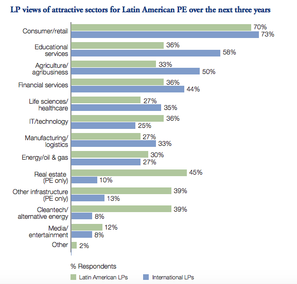 To get around pockets of risk, pan-regional funds are still the most popular vehicles among LPs that want Latin America exposures. Nearly 80% of international LPs and over half of Latin American investors expect to access Latin American PE via pan-regional funds in the next three years, according to the study. Investors are also showing a preference for buyout and growth capital strategies. The graph below highlights sector exposures that investors are interested in -