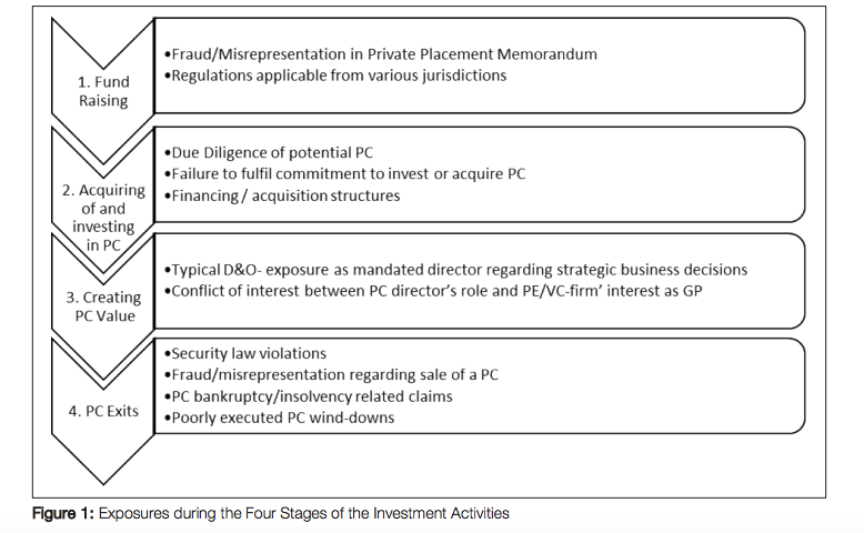 Stage 2 - Investing and Acquiring of Portfolio Companies (PC) Once the investors are on board and the necessary commitments have been received in the first closing, the fund manager enters into the stage of performing due diligence reviews of potential target companies. The selection of a PC as such, the chosen structure, the type of financing of the acquisition and other decisions taken in the context of the acquisition can be grounds for complaints by the investors. Whereby these allegations will be made by investors there is also a risk coming from another side: potential or future portfolio companies can claim compensation from the PE-firm or the fund manager for the failure to fulfil commitments to invest or acquire the portfolio company. Stage 3 - Creating PC Value The focus of the investment is to increase the value of the PC. The PE-firm will intend to do so by gaining influence on the business model of the PC sending employees to sit on the different board of directors. One person may hold between four to eight board seats. The PE-mandated directors are often directly engaged in strategic management decisions with the aim to make the PC more profitable and enhance their value. And, as directors, they are personally liable for wrongful management decisions. When the PC does not show the expected development and increase in value the range of potential allegations claiming wrongful management decisions or omissions is wide. The PEmandated director can consequently be facing allegations like any ‘regular’ board member An additional risk, specific to the role as PE-mandated director, arises out of their ‘double role’ which can lead to a potential conflict of interest: Being sent by the PE-firm to act as director to the PC, the employee is requested to act in the interest of the PE-firm (or the GP) whereas in the position as board member of the PC, the director has to act exclusively in the interest of the PC. In fact, allegations of conflicts of interests are widely seen in claims. Claims filed against board members of a PC can originate from various sources: the original founders of a PC, other members of the management, creditors, shareholders, competitors, suppliers, vendors, governmental/regulatory agencies or company employees. Even the PC itself can be the claimant and in such cases will not indemnify the director for the damages they claim. Stage 4 - Portfolio Company Exits There are a number of options available how the PE-firm can exit a PC: sale, IPO or - in case the investment did not develop well – ‘close the doors’ (write down, liquidation, bankruptcy) – only to name a few. In the course of the divestment various aspects need to be monitored by the management of the PC. A potential breach of obligations can occur in different areas: a violation of applicable securities laws, misrepresentation or fraud in respect of the sale of a PC (potentially in a prospectus), non-fulfilment of contractual obligations of an M&A contract, duties of notification related to a bankruptcy proceeding of the PC, poor execution of the PC wind-down, negligence in respect of general reporting and information duties towards regulatory bodies or investors etc. with branch-offices and subsidiaries abroad, advising or managing offshore funds that hold SPVs and PCs in a variety of jurisdictions, and their directors have to comply with several legal and regulatory frameworks. Regulatory investigations and criminal prosecutions are often followed by civil law claims for compensation. In times when the company has financial problems, needs to be liquidated, a receiver is appointed or the company has already gone bankrupt, the management is facing a larger risk of being held personally liable for losses that shareholders, the entity or third parties have suffered. As the members of the management are thus putting their private assets at risk3 , such scenarios can turn into a very threatening situation.Even if the claimant has to prove that a wrong managerial decision or omission is the cause of such loss the manager will most probably defend him or herself immediately and incur substantial legal defence costs. Claims filed against board members of the PE-firm, of a fund or of a PC can originate from various sources: investors, competitors, suppliers, vendors, the PE-firm, the fund or the PC itself, its employees and management as well as other board members. Conclusions The liability risks a PE/VC-firm or their directors can be exposed to are many. As part of an enterprise-wide risk management, the directors of a PE-firm or a fund should evaluate how to mitigate these risks. This can be done by setting up a state of the art IT system, enhancing internal procedures and protection measures, training employees or adding audits. With respect to the residual risk after such mitigation efforts, a decision will have to be made on how much of the risk shall be transferred to external parties by e.g. concluding an insurance. For a director it is crucial to establish if the portfolio company, which he/she is joining as director, has D&O coverage in place. If in place, it is sensible to get specialist advisors to review and determine the coverage and the limits of liability provided. Alternatively, the director should request the PE-firm to arrange D&O insurance coverage extending to all mandated director positions on the board of multiple PC. With complex contracts, the devil is in the detail. Expert advice from an independent insurance broker is recommended. It is essential to have the terms of the insurance contract, definition of terms, exclusions, as well as obligations of the parties to the contract carefully reviewed in respect of the specific situation of the PE-firm. In addition to reviewing the policy terms and conditions, the board should take into consideration the insurer’s financial strength, underwriting expertise and claims-paying reputation. Editors Note: This article was abridge